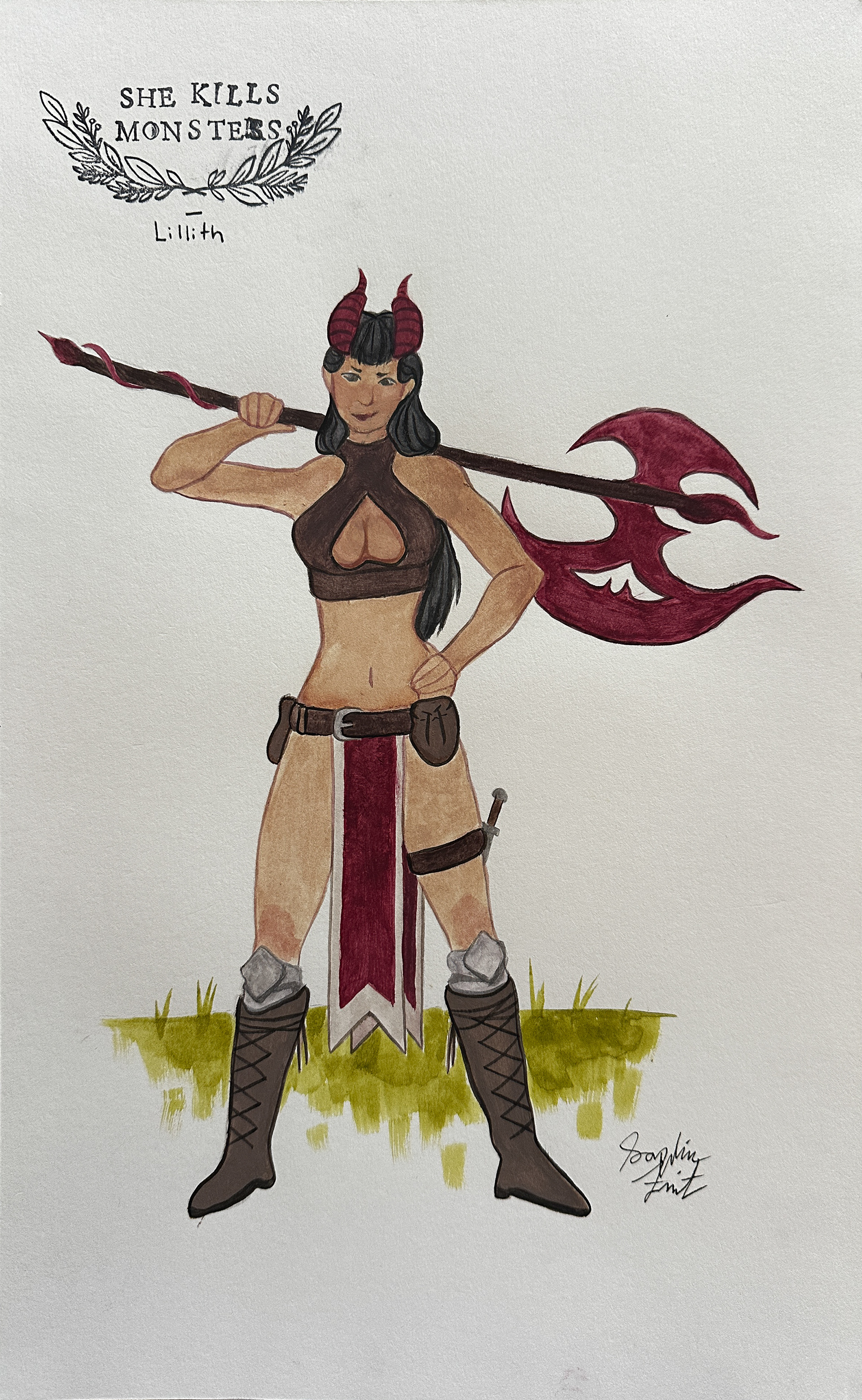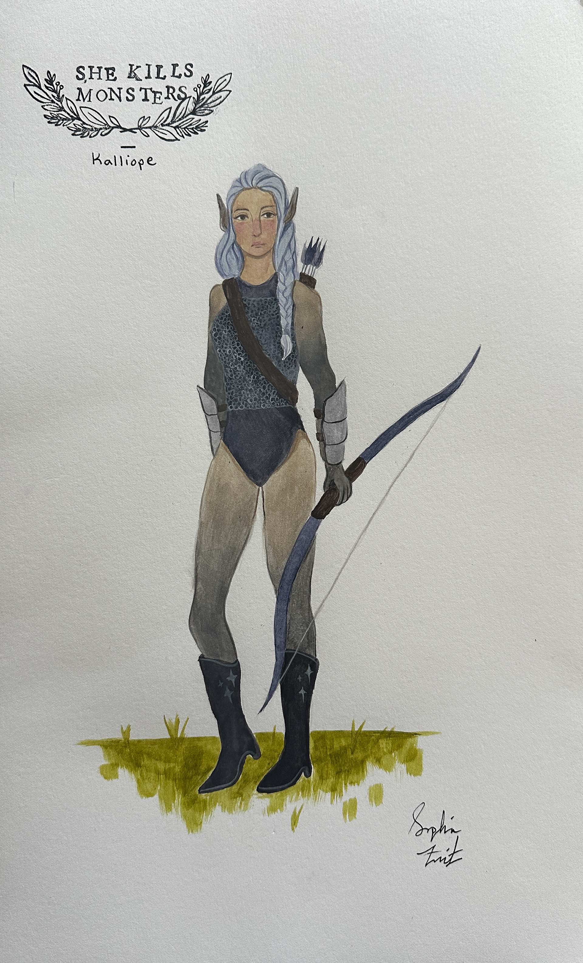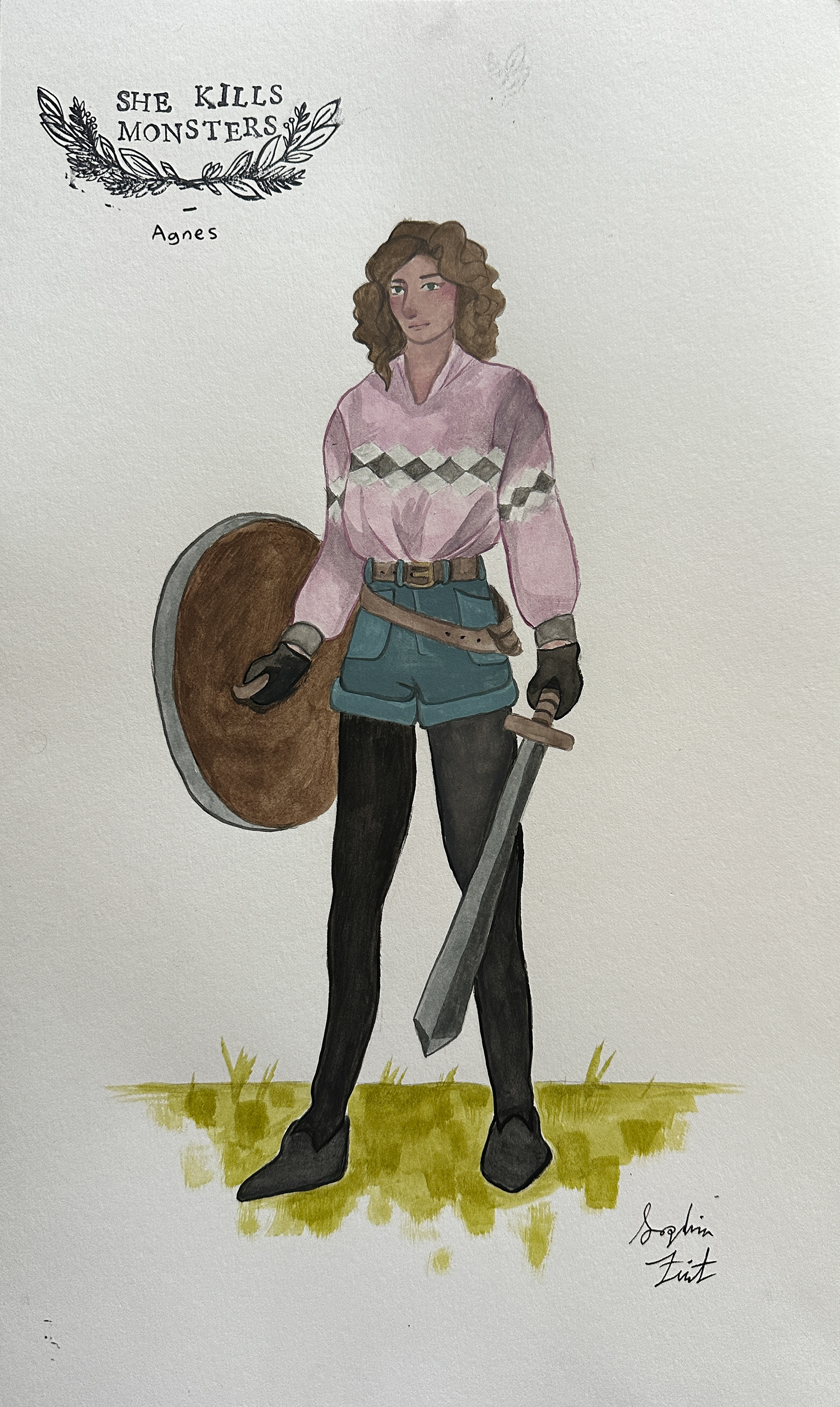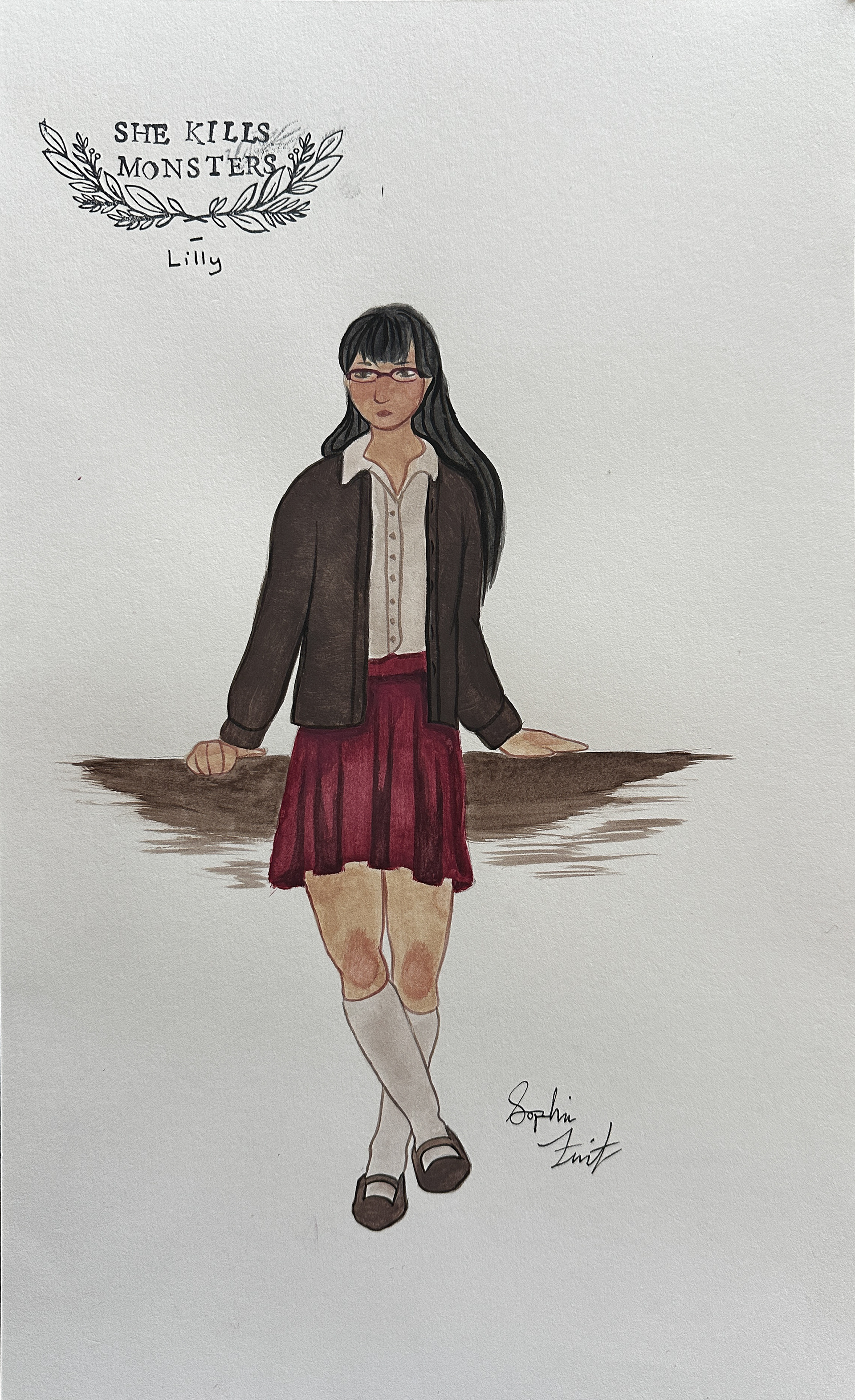 Costume renderings for the play "She Kills Monsters", gouache, May 2025