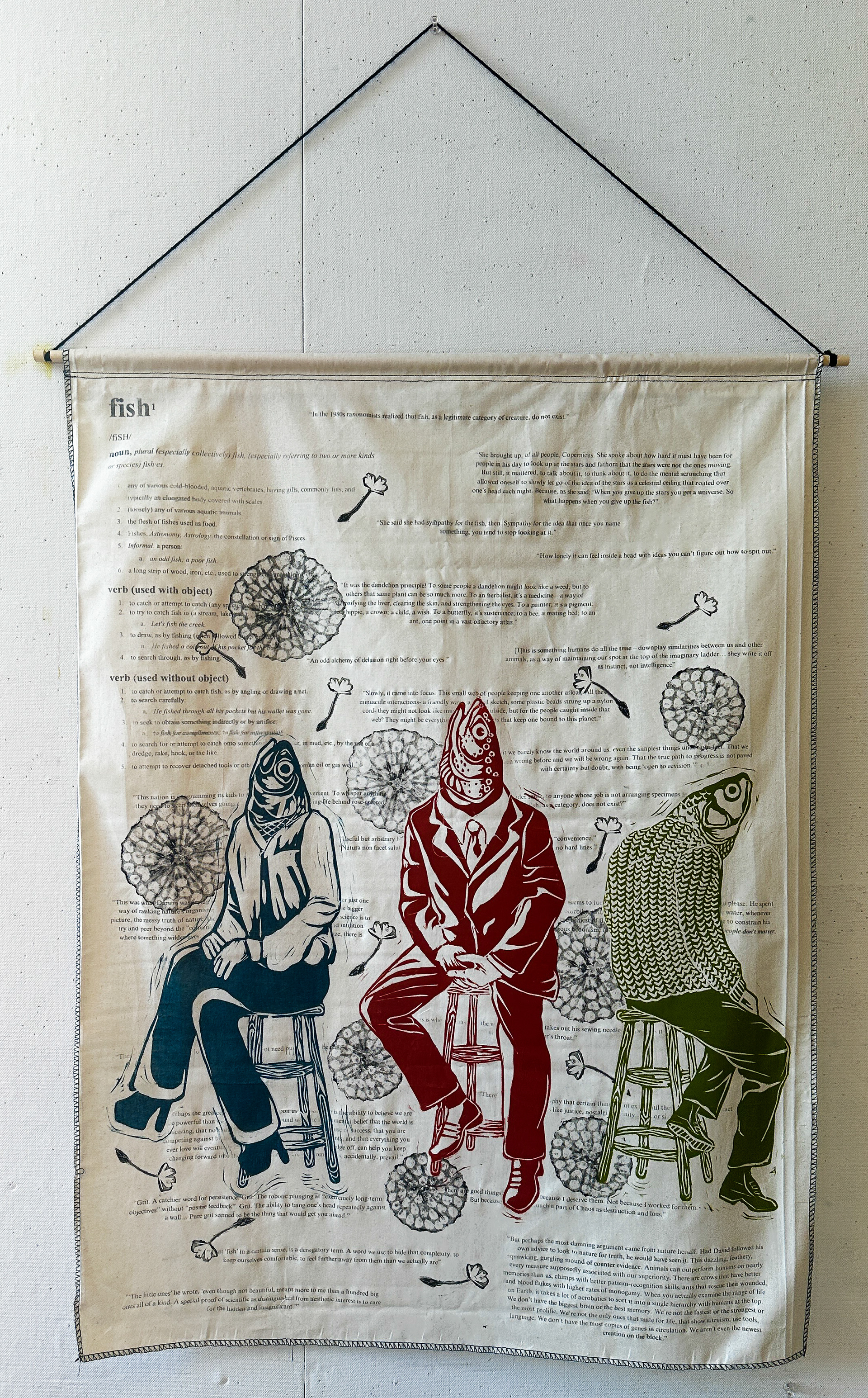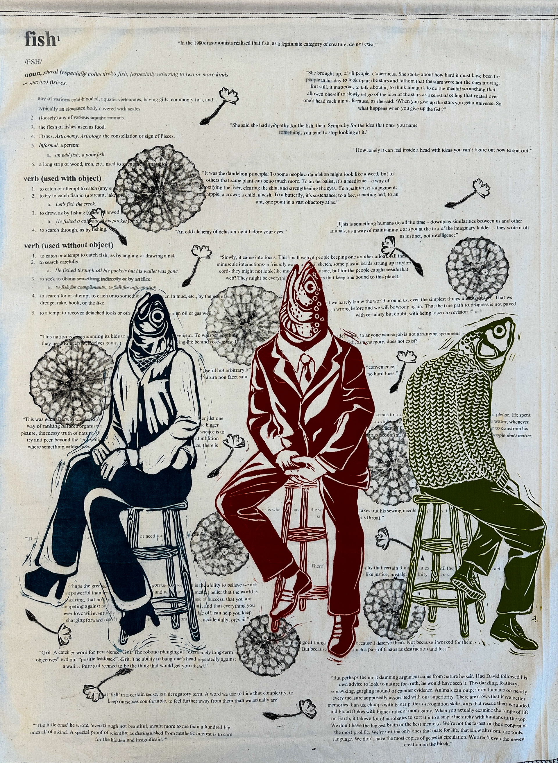 Why Fish Don't Exist, Linocut, collagraph, and solvent transfer on muslin, December 2024